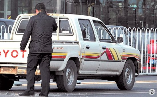 嫌犯駕駛的皮卡車右后側玻璃被民警砸成Y字形
