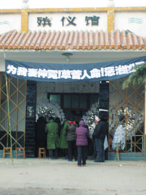 “沒有的事,我們從來就沒接受這一說法。”李莉生前的一名鄰居搖頭對(duì)記者說。他指著殯儀館門口懸掛的寫有“草菅人命,懲治兇手”等黑色大字的白色橫幅介紹說:“我們?cè)跉泝x館住了三四天了,就是希望能夠有一個(gè)公道的說法,希望能夠懲治兇手,告慰死者。”