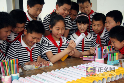 資料圖片:棗莊市市中區(qū)紅旗小學(xué)的學(xué)生在給家長制作帶有吸煙危害警示語的“香煙”模型。