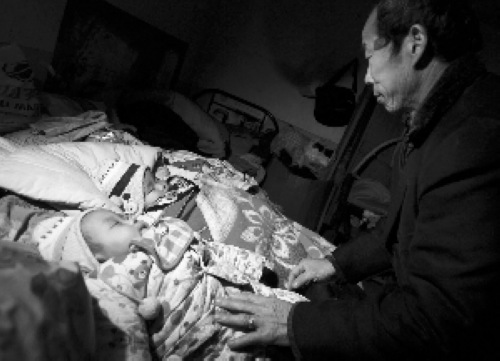 老人撫摸一對龍鳳胎孫子孫女。因妻子生產(chǎn)后身亡,孫雪峰將兩家醫(yī)院告上法庭。昨日,該案進(jìn)行了鑒定質(zhì)證。記者 吳江 攝