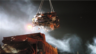 吊車將被壓得面目全非的轎車起吊。記者趙恩澤攝