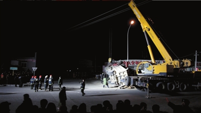 晚10點左右,大貨車被吊車扶正,其間汽修店出現(xiàn)輕微的震動。隨后不久,消防員和急救人員從小轎車內(nèi)相繼抬出4名20歲到30歲左右的男子。經(jīng)檢查,4人均已死亡。