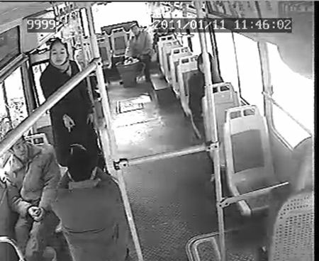 12日中午11點43分30秒,由于已接近終點站,車上只有五六名乘客。靠后車門的位置上,一名圍著粉紅圍巾、穿中長大衣灰色西褲的年輕女士站起身,朝車外張望。“師傅,停一下,我就在這里下。”