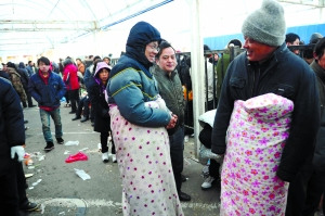 來自湖南常德的牟師傅和工友裹著棉被排隊買票準備回家。1月17日清晨,寒潮襲擊杭州,氣溫降到-4℃。在原杭州汽車東站春運火車票大賣場,牟師傅和他的兩名工友,裹著棉被在寒風中等待買票。為了一張回家的車票,牟師傅從前一天晚上六點就從下沙趕到這里通宵排隊,連續排了兩天。