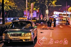 昨晚記者趕到現(xiàn)場,警方已拉上封鎖線,對現(xiàn)場進(jìn)行勘驗(yàn),并將肇事司機(jī)帶上警車。記者看到,肇事男司機(jī)中等身材,身高1.72左右。斑馬線的北邊約15米處,倒在血泊之中的林先生已被一塊大布覆蓋。在尸體北面的六七米之處,一輛車牌號為粵A694B8的綠色出租車停在路邊。記者借助路燈,卻沒看到馬路上有任何的剎車痕跡。路邊的目擊者稱,當(dāng)時的車速飛快,估計都沒剎車。