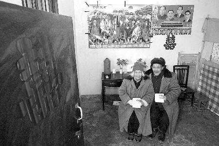 新房10平米左右,顯得干凈整潔。床上有紅色床單、紅色被子和印著喜字的大紅枕頭。潘大爺笑呵呵地把記者迎進屋里,笑容一直出現(xiàn)在他溝壑縱橫的臉上。“你看,這就是我們的結(jié)婚證。”老人激動地拿出結(jié)婚證,證上顯示他們結(jié)婚日期是2011年1月5日。潘大爺把鐘老太太扶到椅子上坐好后,將暖手器塞進她的懷里,對記者說:“這是我的第一個老婆,我要照顧她一輩子。”老太太由于聽力下降厲害,聽不見潘大爺?shù)脑挘珡乃劭衾锖难蹨I可以看出,她很激動。