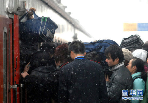 1月19日,杭州火車站幾位旅客排隊(duì)擠上回家的列車。新華社記者 鞠煥宗 攝