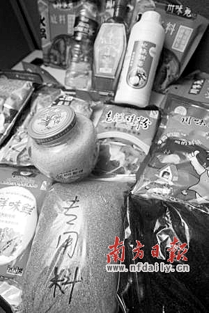 在東莞信立農(nóng)貿(mào)批發(fā)市場,可以輕易買到各種食品增香劑。“飄香劑、肉松散、肉香王,你要多少有多少,你要什么品種就有什么品種。”一位批發(fā)商向記者推銷。