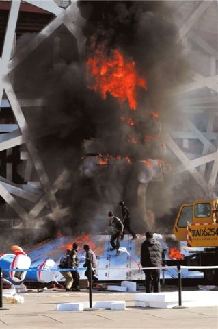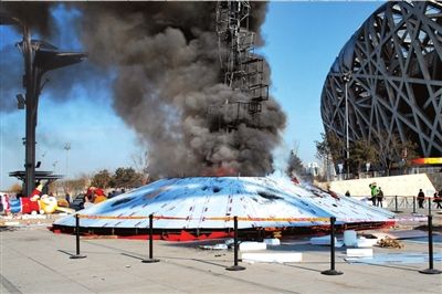 昨天中午,國家體育場西側50米處,一座正在施工中的塑料雕塑“祥云玉兔”突然起火。當事工人稱,可能是焊接點濺出火花,引燃底座的泡沫材料,致使整體結構起火。