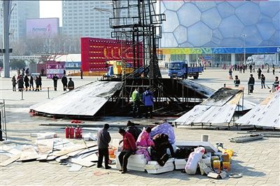 據游客李先生介紹,昨天中午12點左右,鳥巢西側區域冒起滾滾黑煙,“我們都以為是鳥巢里面著了”,當大家繞到西側看到,一鋼結構架子正燃燒,其底部為“祥云”,一旁擺有3只“玉兔”雕塑。火勢迅速向下蔓延,燒到“祥云”。