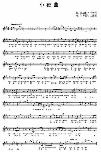 托塞利小夜曲乃世界名曲。我在大學期間,同學們經常吟唱,至今仍給我留下深刻的印象。絕大部分唱詞我都能寫得出來。但少數唱詞只能哼其聲而不能知其意。近幾年我遍訪京滬等地音樂學院、過去的老同學、老教授乃至九十幾歲的周小燕同志,均未有結果。
