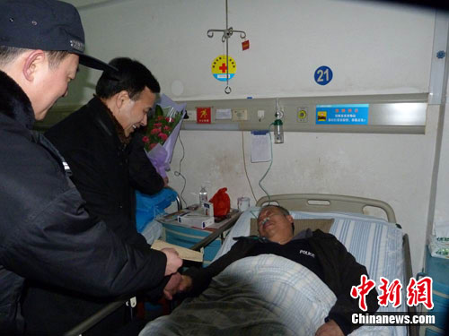同事看望慰問躺在病床上的老陳。中新網(wǎng)發(fā) 李寧 攝