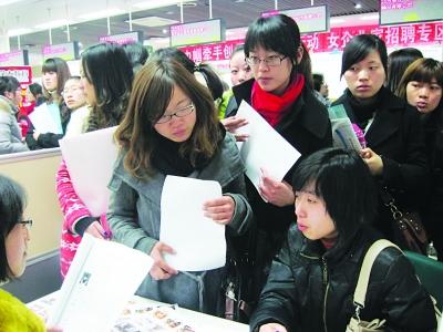昨天的這場招聘會是女大學生專場,雖然并不阻攔男生入場,但記者在現場看到,前來應聘的基本上是清一色的“娘子軍”,盡管偶爾也能看到男生的身影,但一問才知道,他們幾乎都是來“打醬油”的。男生小吳就是其中一位,“我就是幫女朋友來投簡歷的,”他告訴記者,女朋友臨時有事來不了,于是就托他代投。而另一位男生周同學則顯得有點窘迫,笑著對記者坦稱“鴨梨很大”:“起初我并不知道是女生專場招聘會,在路上聽同學說有招聘會,就回學校拿了幾份簡歷趕過來。結果進門一看就傻眼了。”不過好不容易來了一趟,小周還是頂著“鴨梨”在招聘會場轉了一圈,“我學的是市場營銷,總共投了三份。”