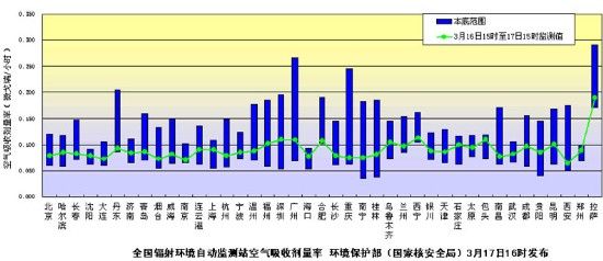 環境保護部(國家核安全局)有關負責人今日介紹說,環境保護部(國家核安全局)3月17日16時繼續發布全國省會城市和部分地級市輻射環境自動監測站實時連續空氣吸收劑量率監測值。監測結果匯總圖中綠色曲線代表監測值,藍色柱體代表天然本底水平,綠色曲線均在藍色柱體范圍內。監測結果表明我國環境輻射水平未受到日本核電事故的影響。