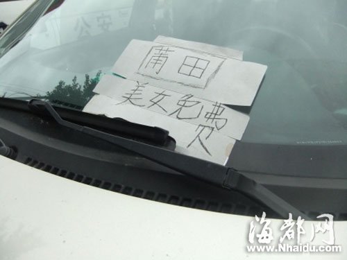 據火車站派出所民警介紹,他們起初并沒看到這個雷人紙牌,只是發現黃金酒店前圍著很多人。民警過去一看,酒店門口停著一輛寶馬7系的豪華轎車。“拉風”的不是車,而是司機。這個二十出頭的小伙子,把香煙紙盒撕開,背面隨手寫了幾個字:“莆田,美女免費。”