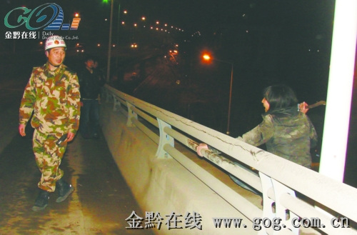 “不要過來,誰敢過來我就跳下去,反正我也不想活了!”這名女子情緒激動,邊揮舞手中木棍,邊大聲叫嚷。幾名過路的市民發現女子神情不對,想要靠近她,勸她離開橋沿,卻遭到了女子的強烈抵觸,誰也不敢再上前刺激她。隨后,有人撥打電話報警求援。一會兒,民警和貴陽市消防特勤一中隊的官兵趕到了現場。