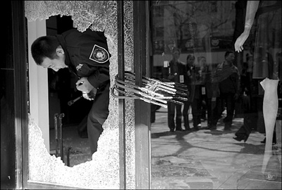 昨天上午,記者在被砸的一家女裝店門前看到,鋼化玻璃門被砸出一個(gè)大窟窿,但門上4把鎖未被撬開,門前還留有幾塊碎裂的磚頭,地面上布滿了鋼化玻璃碎片。為了保護(hù)現(xiàn)場,店內(nèi)工作人員從被砸出的窟窿進(jìn)出。其余3家店則均只上了一把鎖,全被撬壞。據(jù)了解,4家店丟失的財(cái)物包括一臺價(jià)值3000多元的數(shù)碼相機(jī)和5000多元現(xiàn)金。