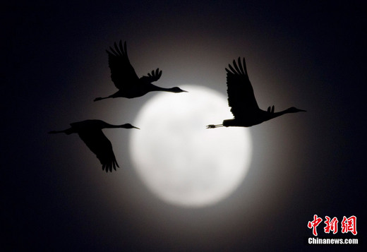 資料圖:2011年3月18日,美國(guó)內(nèi)布拉斯加州,沙丘鶴飛過(guò)升起的月亮。美國(guó)航空航天局發(fā)布消息說(shuō),19日,月球?qū)⒌竭_(dá)19年來(lái)距離地球最近位置,它與地球的距離僅有35萬(wàn)多公里,從地球上觀看,月球比遠(yuǎn)地點(diǎn)時(shí)面積增大14%,亮度增加30%,號(hào)稱“超級(jí)月亮”。
