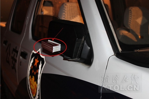 另一輛警車反光鏡上綁著的火柴盒(記者李景輝攝影)