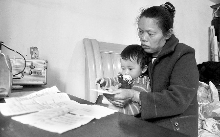昨日,抱著揚揚的蹇女士望著桌子上的一堆欠條顯得無奈。蔣雨龍 攝