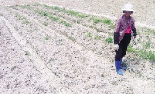 導報記者站在田邊,遠遠望去,連片的田地是青一塊黃一塊。走近了看,青的是已長成大約有30公分高的水稻苗;黃的則是干泥巴或已近枯黃的農作物的顏色,上面還長著一些雜草。
