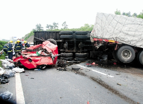 一前一后,一輛紅色一輛藍色,兩輛“巨無霸”撞在一起堵住了整條高速公路。更為觸目驚心的是:兩輛車的駕駛室被撞得扁扁的,里面的司機還活著嗎?