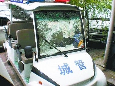 圖為被砸壞的城管執(zhí)法車。記者 蔡曉智 攝