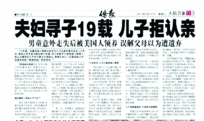 落戶蘇州的安徽蕪湖人李緒文,19年鍥而不舍尋子的故事經(jīng)本報(bào)披露后,得到社會各界關(guān)注。昨天,記者獲知最新進(jìn)展:民政部下屬的中國兒童福利和收養(yǎng)中心,省民政廳下屬的江蘇省涉外婚姻和涉外收養(yǎng)登記服務(wù)中心(以下簡稱“江蘇雙涉中心”)均非常關(guān)注此事,并將在法律允許的范圍內(nèi)積極“搭橋”,聯(lián)系當(dāng)時(shí)的美國收養(yǎng)機(jī)構(gòu),轉(zhuǎn)達(dá)李緒文夫婦尋找李祥的消息。