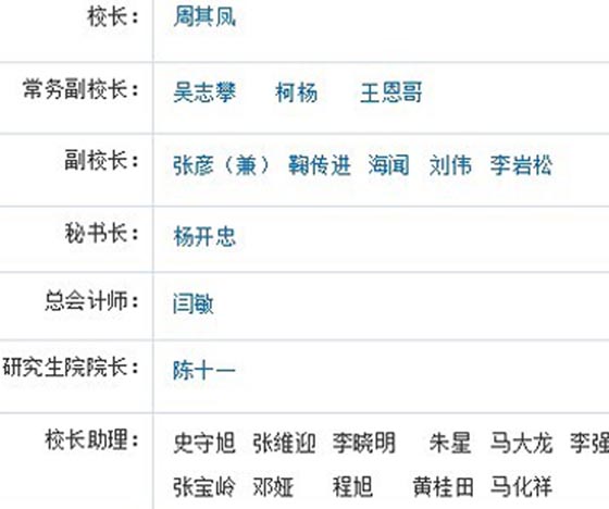 此外,記者發現,清華大學的校領導機構沒有設置校長助理,但是各級別校領導總數也達到了23人。中國人民大學的校長有6位助理,但是校領導機構的人數則比北大和清華要少,僅為16人。