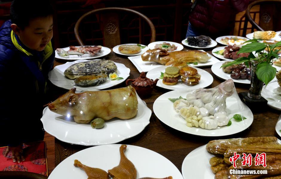 2月1日,中國農(nóng)歷猴年新春佳節(jié)將至,正在福州古街展出的143道不乏福州傳統(tǒng)特色、驚艷眾人的壽山石作品“滿漢全席”,吸引眾多市民及外地游客前來觀展。這些“菜肴”均由產(chǎn)自福州的各類壽山石雕刻加工而成。劉可耕 攝