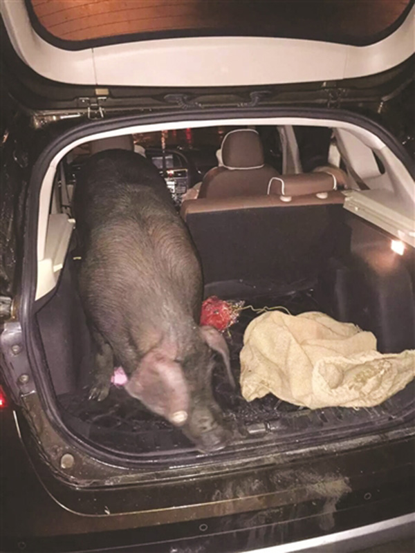 員工將SUV的后排座椅放下,把烏豬塞了進去。
