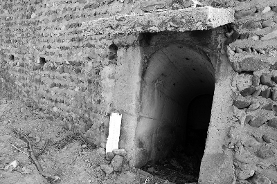 北側洞口直接嵌在擋土墻中,洞口瘦高、拱頂,足夠一人出入,門洞上方設一擋板,地道四壁為混凝土砌筑,看上去非常結實。進洞后下臺階兩米后左轉,里面一團漆黑,用手電照射發現通道已被垃圾封阻。