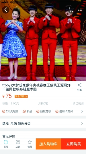 昨天凌晨,央視猴年春晚剛一結(jié)束,演員同款服裝以及晚會(huì)上演出所用的道具便開始在網(wǎng)上熱銷。相比往年都是演員服裝“一枝獨(dú)秀”,今年在演出中所出現(xiàn)的道具成了搶手單品。而在演出服裝中,演員閆妮所穿的西服套裝和TFboys所穿的一身紅色套裝更是日銷數(shù)量可觀。