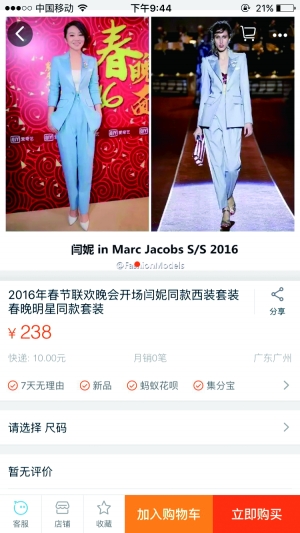 除夕夜的猴年春晚上,閆妮在舞臺(tái)上演出開場(chǎng)大歌舞。節(jié)目中,她身穿水藍(lán)色的西服套裝。節(jié)目結(jié)束不久,同款西裝出現(xiàn)在網(wǎng)上,店主還在旁邊標(biāo)注“接受大量預(yù)訂”,價(jià)格也是從幾十元至上千元不等。一家網(wǎng)店店主告訴北京晨報(bào)記者,工廠已經(jīng)連夜趕工制作同款服裝,現(xiàn)在接受預(yù)訂,年后可以發(fā)貨。記者看到,該店的預(yù)訂量已經(jīng)有40余件。