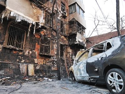 昨日,團結湖北二條一號樓外墻被熏黑,樓下還有一輛被燒毀的轎車。新京報記者 王嘉寧 攝