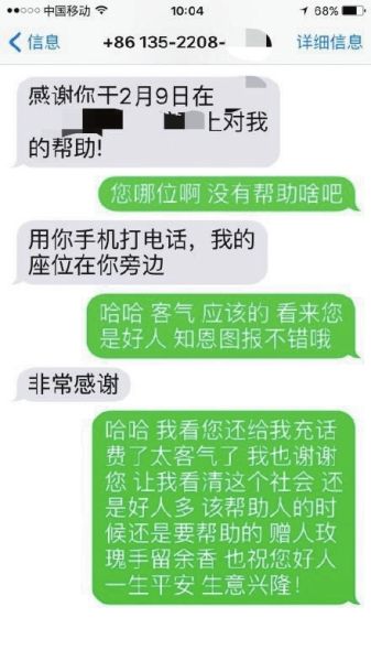 借手機的徐先生認為,張先生能在素不相識的情況下信任自己,把他的手機借給自己,實屬難能可貴。他當時借手機的時候還非常猶豫,覺得別人不會相信自己。張先生的行為,讓徐先生認識到,這個社會還是充滿了正能量。(記者韓林君)