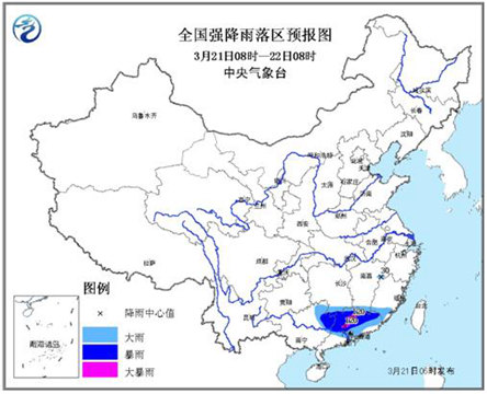 未來三天,強降雨還將持續。中央氣象臺今天繼續發布暴雨藍色預警。預計,21日08時至22日08時,廣西東北部、廣東中北部和珠三角地區、湖南西南部、江西南部、福建南部等地的部分地區有大到暴雨,其中,廣東中北部等地的局部地區有大暴雨(100~120毫米);上述部分地區有短時強降水,最大小時雨強可達30~60毫米,局地并伴有雷暴大風或冰雹。