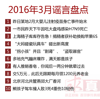 人民網(wǎng)北京4月7日電(記者孝金波 實習(xí)生韓亞云)3月,山東疫苗事件備受關(guān)注,衍生謠言隨之?dāng)U散;“充氣蹦床爆炸”等熱點事件被移花接木夸張傳播;“吃大盤雞感染禽流感”、“搶孩子”等舊謠改頭換面卷土重來……“求真”欄目對3月謠言進行盤點梳理,推出“盤點3月十大假新聞”榜單。