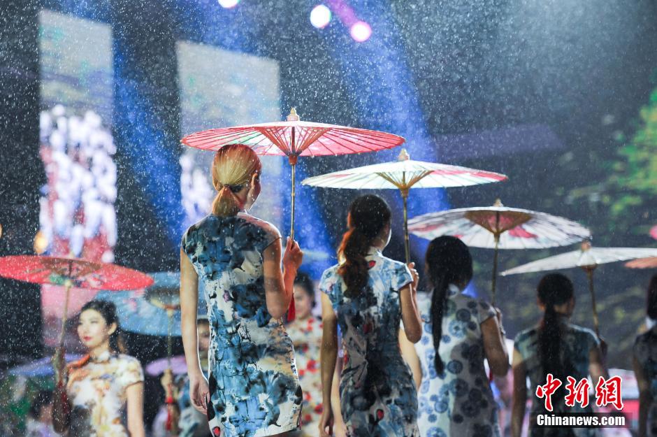 5月8日,模特身著旗袍手持油紙傘雨中走秀。當日,以“慈善愛心·環保美麗”為主題的第31屆全球城市旅游小姐中國區決賽頒獎盛典在貴州省赤水市舉行。本次大賽作為第11屆貴州旅游產業發展大會系列活動之—,共吸引海內外50多名選手同臺競技。中新社記者 賀俊怡 攝