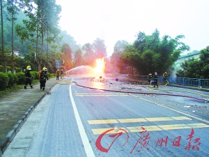 中隊指揮員立即下達作戰命令,帶領兩名攻堅隊員,穿戴好重型、輕型防化服,在泡沫槍的掩護下,架設好移動水炮,利用遠程遙控完成對火災現場的正面壓制,同時命令中隊官兵用兩支泡沫槍分別從火場正面、側面對流淌火勢進行圍堵,于昨日上午9時40分左右成功撲滅現場明火。在隨后的冷卻警戒階段中,消防官兵在水槍的掩護下將事故車輛上其他發生泄漏的11個鐵質存裝桶轉移。