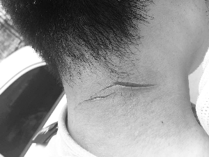 直到將關某完全控制后,曹彤焱才感到自己的后脖子有點疼,伸手一摸,一手血。同事迅速將傷口簡單處理后,立即將曹彤焱送往醫院包扎。經檢查,曹彤焱后脖頸被刀劃傷兩處,共縫了十多針,而關某則毫發無損。