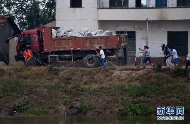 7月10日,身系安全繩的搶險人員(左一)在載滿麻石的卡車墜入潰口前,跳出駕駛室。當日上午,湖南省華容縣新華垸發生重大管涌險情,10時57分出現潰口。在搶險救援中,出現了一種驚心動魄的方式:身系安全繩的搶險人員駕駛著載滿麻石的卡車駛向潰口,在卡車墜入潰口前跳下卡車,用連車帶石的方式堵潰口。目前搶險救援工作仍在進行中。新華社記者 李尕 攝