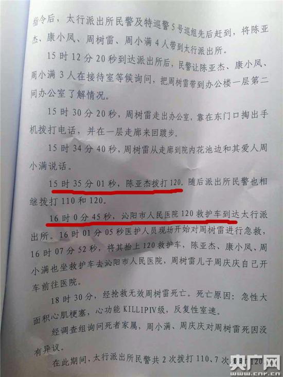 陳亞杰這樣描述當(dāng)時的經(jīng)過:他說不舒服的時候我就馬上打的120,我說太行派出所有人暈倒了,(120)他說哦,馬上到!我記得很清楚,對方是 個男的。打過120之后急救車已經(jīng)過來了,但是沒進院里,我聽見聲音了,到了之后又走了。我媽說了一句怎么來了又走了,我趕緊15點37分又給120打了 一次。我說趕緊過來唄,那邊說已經(jīng)派車過去了。