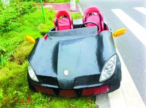 只見這輛車車頭貼了個“保時捷”的車標,車身坑坑洼洼,做工粗糙。交警發現,這輛車除了儀表盤沒有,車輛的方向盤、油門、剎車、車頭大燈、尾燈一應俱全,竟然還設置了前進和后退兩個擋位。當交警詢問車輛發動機位置時,司機竟表示這車是用200CC摩托車發動機車頭改裝的。