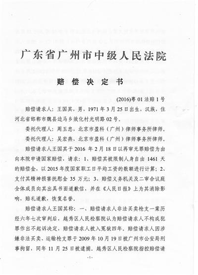 2013年,廣州中院啟動再審程序并作出判決,撤銷前面的終審裁定和越秀區(qū)法院一審判決中的量刑部分,但維持了一審法院定罪部分,以非法買賣、運輸槍支罪,改判王國其有期徒刑4年。由于低于法定刑期,判決需報請廣東高院與最高法核準后生效。