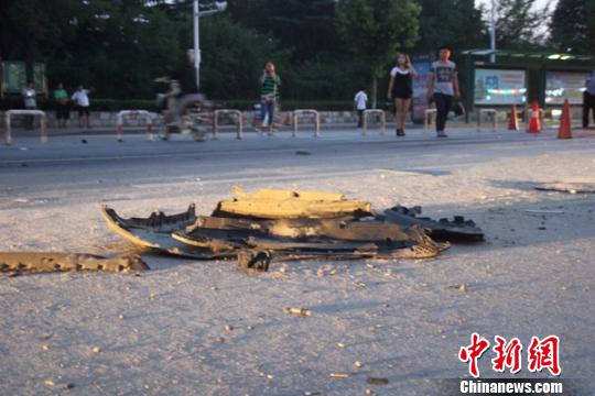 現場散落的破碎車輛保障杠。 于俊亮 攝