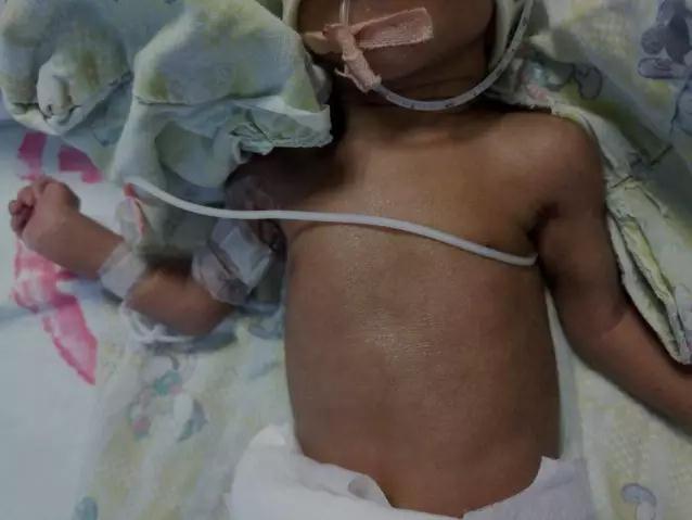 7月初,在福州市第一醫(yī)院,產(chǎn)婦阿玲(化名)早產(chǎn),懷孕僅33周,她就誕下了小黑,當時,小黑重度窒息,醫(yī)生緊急搶救后,他立即被轉(zhuǎn)送到新生兒科繼續(xù)治療,戴上了呼吸機。醫(yī)生發(fā)現(xiàn),小黑很瘦弱,軀干只有成人的巴掌大,且全身黑得像包公,尤其是顴骨、頸部、手肘、關(guān)節(jié)等皮膚更黑,連指甲都是黑的,更奇怪的是,他的陰莖僅1厘米長,縮成一團,黑得跟炭一樣。