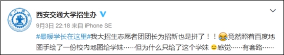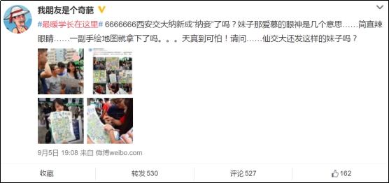 9月3日,西安交大開(kāi)學(xué)迎新時(shí),招生志愿團(tuán)的團(tuán)長(zhǎng)送了學(xué)妹一張校園手繪地圖,瞬間就被學(xué)妹捧為“最暖學(xué)長(zhǎng)”。這事兒還被西安交大招生辦曬到了微博上。這幾天連北大、廈大、華科大等高校也紛紛轉(zhuǎn)發(fā)湊熱鬧,曬出各種創(chuàng)意地圖PK,這“仙交大”的手繪地圖就過(guò)了一把“網(wǎng)紅”癮。