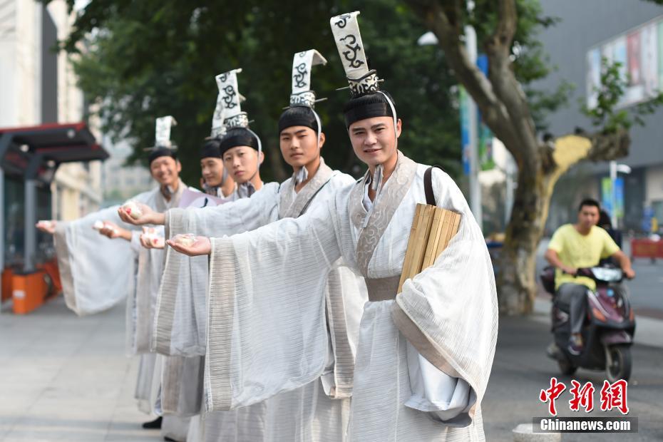 9月8日,一群身著中國春秋戰國時期服飾的年輕人出現在南京街頭,一邊誦讀詩詞,一邊向市民派送免費月餅。據悉,他們來自常州淹城,在中秋佳節來臨之際,希望通過這種形式,喚起民眾對于傳統節日的美好回憶。寒單 攝