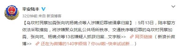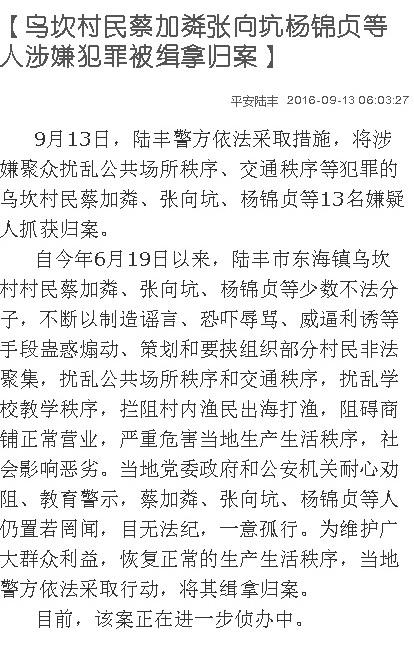 9月13日,陸豐警方依法采取措施,將涉嫌聚眾擾亂公共場所秩序、交通秩序等犯罪的烏坎村民蔡加粦、張向坑、楊錦貞等13名嫌疑人抓獲歸案。